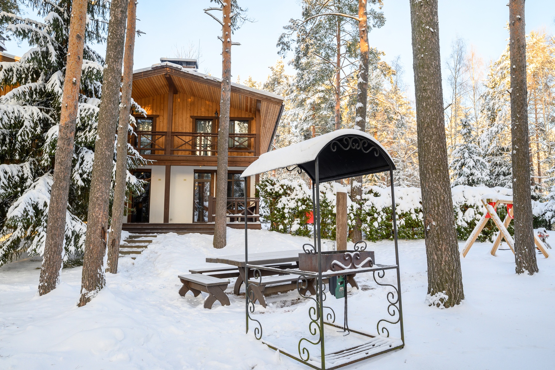 Индивидуальные мангальные зоны предусмотрены у всех типов размещения, кроме «Апартамент семейный», «Апартамент семейный с видом на лес», «Стандартный номер в отеле», «Улучшенный номер в отеле», «Делюкс», «Делюкс +»). Шампуры предоставляются в коттедж. За дополнительную плату можно приобрести решетки, розжиг, уголь.