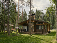 Традиционный коттедж в альпийском стиле обладает высокой функциональностью: основной и гостевой спальнями, объединенной кухней-гостиной, открытой террасой и гриль-зоной. Дровяной камин с каменной кладкой, обилие дерева в интерьере и панорамные окна создают теплую и уютную атмосферу для полноценного отдыха.
