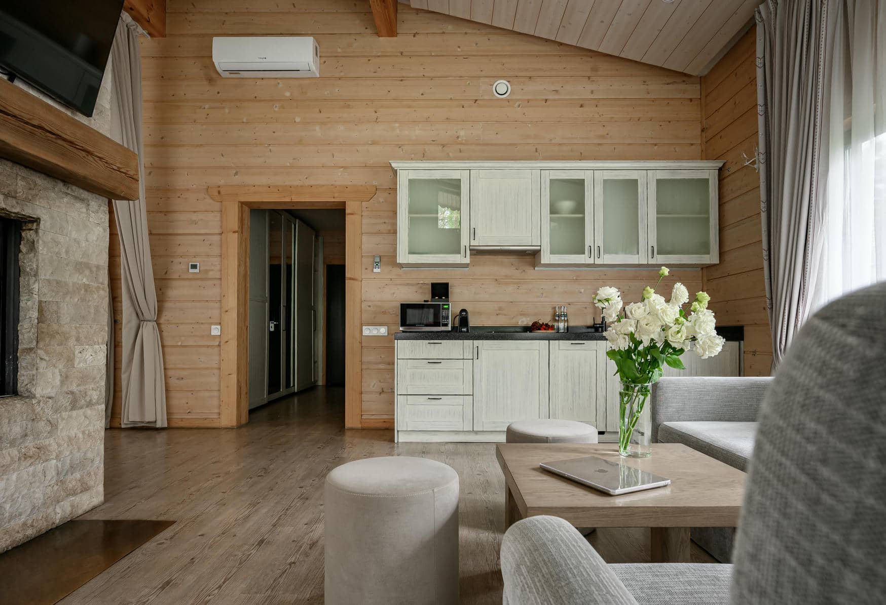 Роскошные двухместные шале для непревзойденного отдыха обладают просторными планировками и продуманным наполнением: кровать king size, декоративная подсветка «звездное небо», двусторонний камин. На открытой террасе можно отдохнуть в джакузи, наслаждаясь панорамным видом на лес.