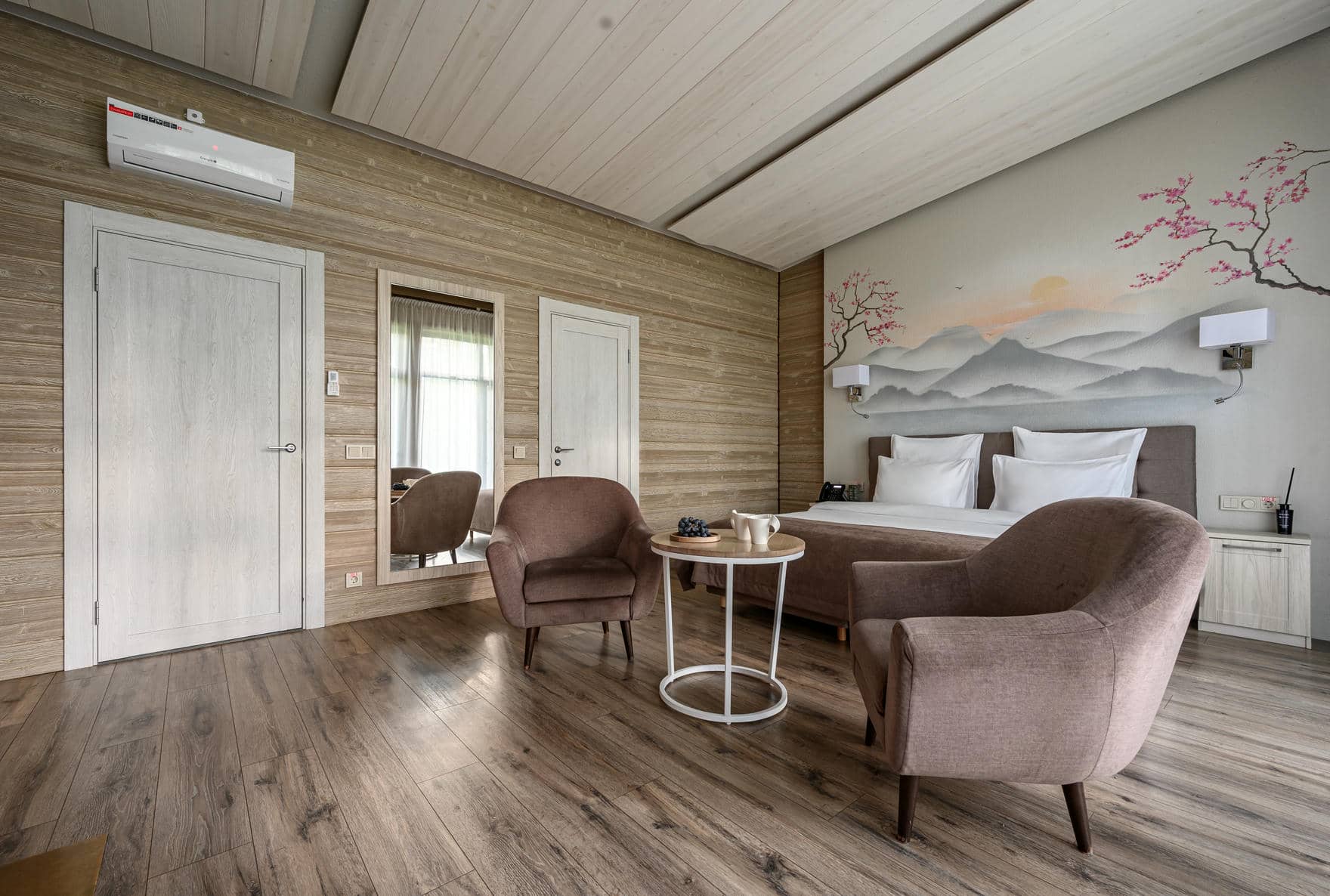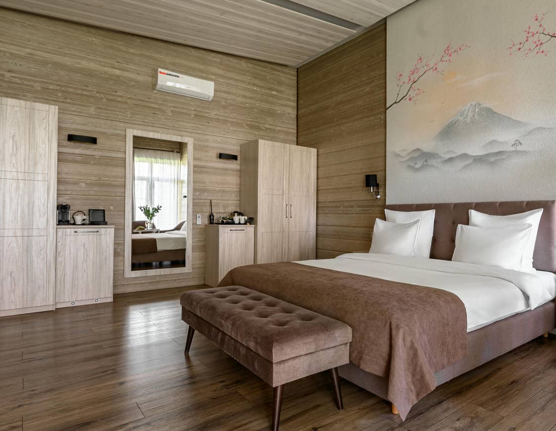 Утонченный дизайн и функциональная планировка создают идеальную атмосферу для отдыха. Двухместные номера с кроватью king size и светящимися панно в японском стиле включают зону отдыха с камином и мягкой мебелью. Приватное расположение в живописной локации подарит чувство расслабления.