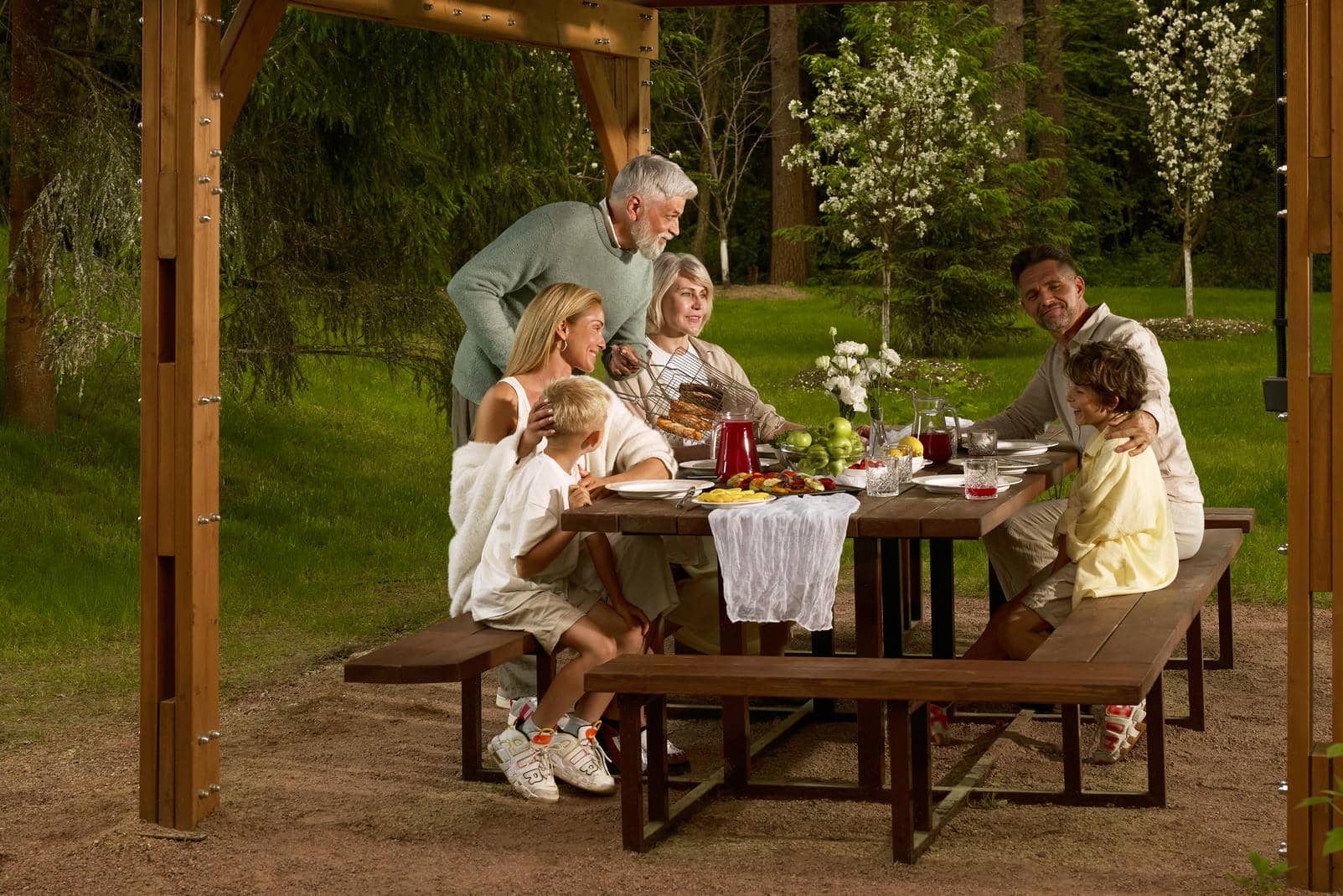 кухня-гостиная с большой обеденной группой и двуспальным диваном
