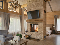 Роскошные двухместные шале для непревзойденного отдыха обладают просторными планировками и продуманным наполнением: кровать king size, декоративная подсветка «звездное небо», двусторонний камин. На открытой террасе можно отдохнуть в джакузи, наслаждаясь панорамным видом на лес.