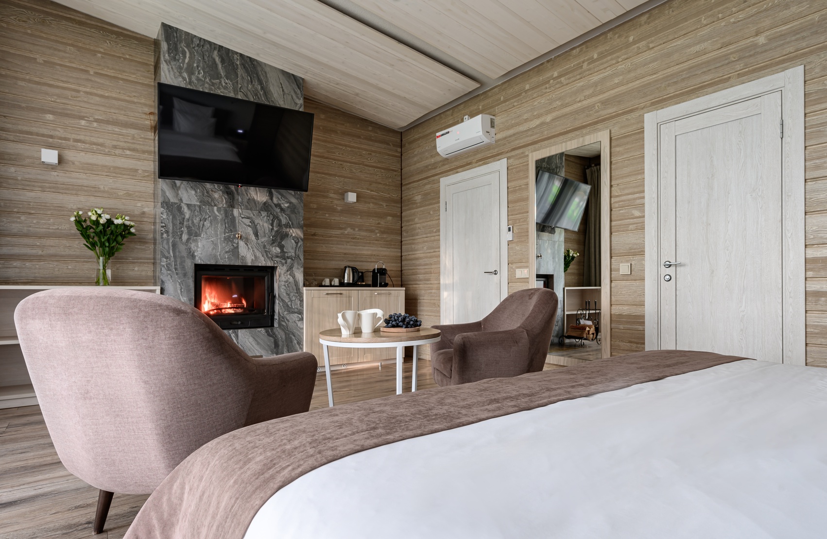 Изысканные двухместные номера с открытой террасой и видом на лесной ручей расположены в уединенной части курорта и располагают к размеренному отдыху. Панорамные окна, кровать king size, дровяной камин и премиальный текстиль создают атмосферу мягкости и спокойствия. В непосредственной близости находится спа-комплекс и ресторан авторской кухни.
